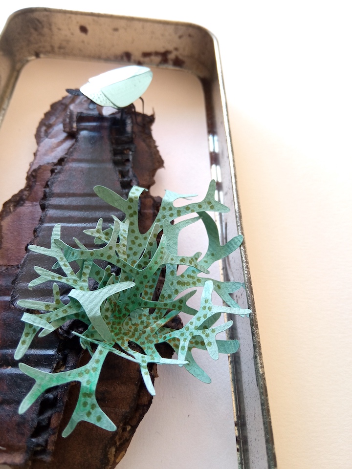 Dans une boite ancienne, patinée par le temps se cache une composition de papier. Découpée et façonnée à la main, la composition comprend une écorce, un lichen et une punaise aux reflets bleus. La boite mesure 7 x 17,5 cm. Elle comporte un système de fixation murale.
