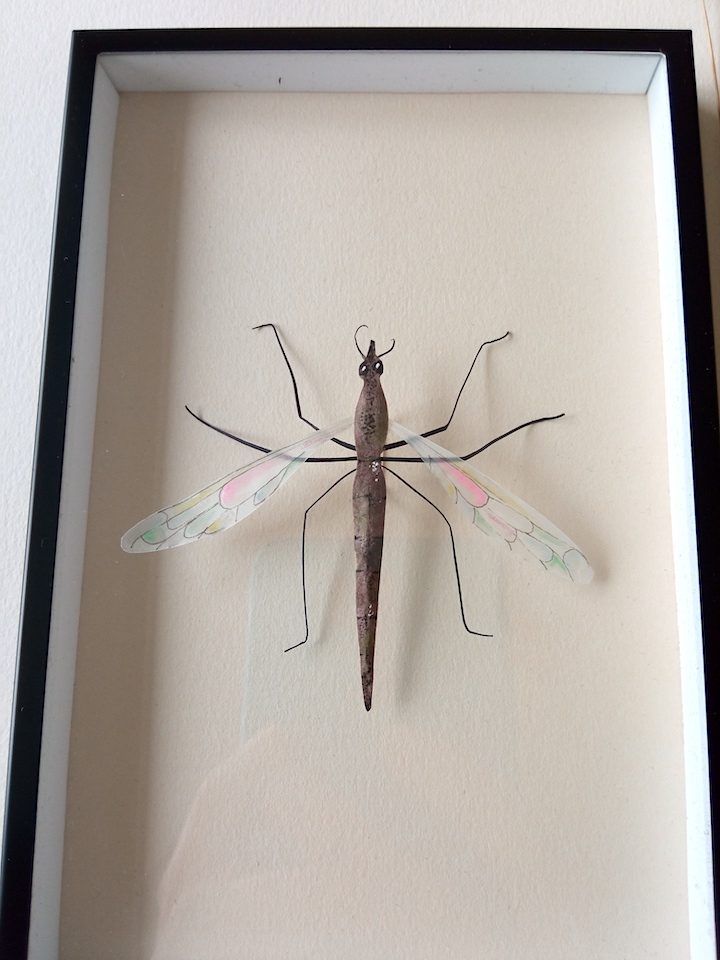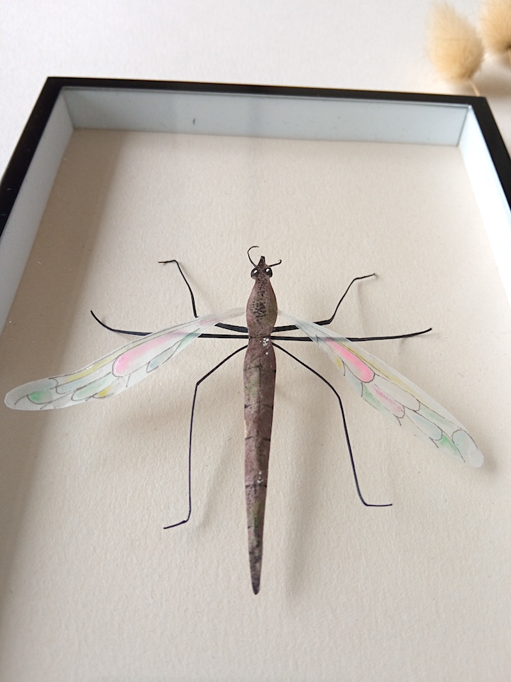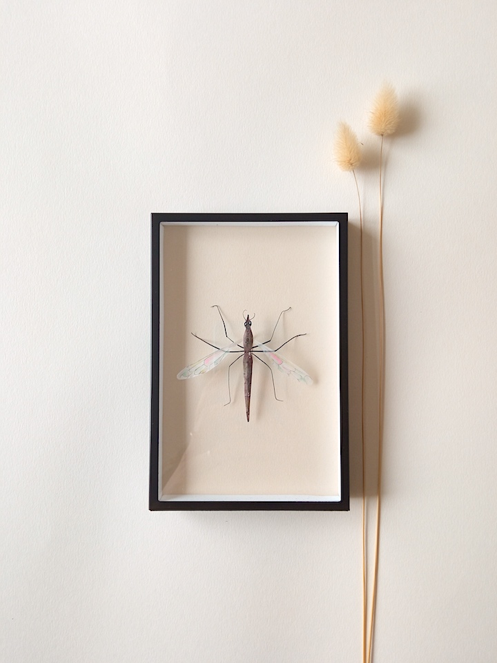 Comme un souvenir des jours d’été figé dans le papier, ce cousin est découpé, façonné et peint à la main. Ses ailes sont délicatement colorées. Il est présenté dans un cadre fin en métal noir de 10 x 15 cm. Il comporte un système de fixation murale.