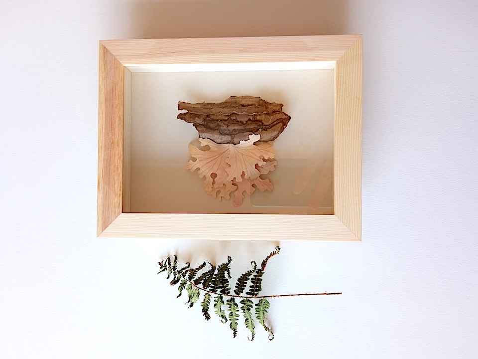 Écorce et lichen composent ce tableau de sous-bois. La composition de papier est découpée et façonnée à la main.