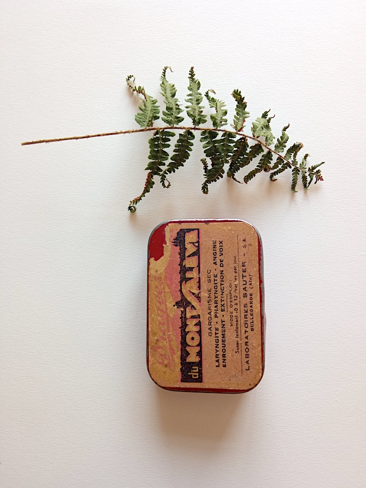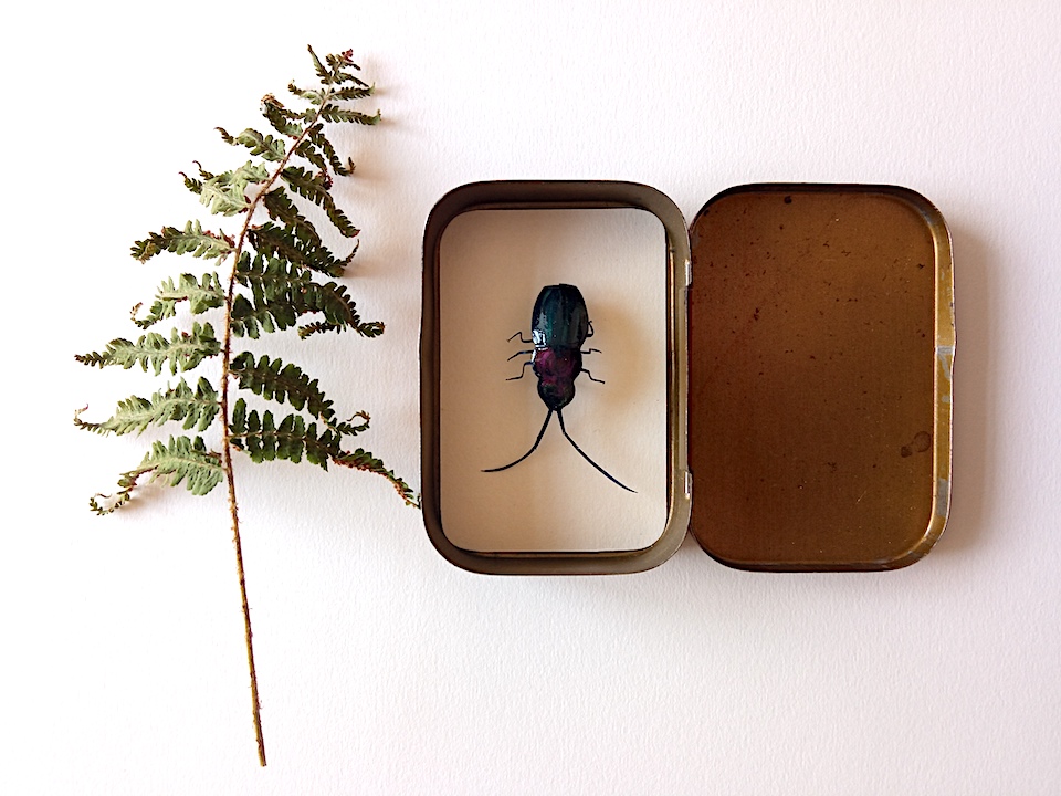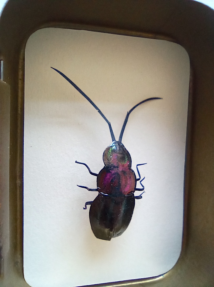Dans une boite ancienne se cache un insecte de papier. Il est découpé et façonné à la main. La boite mesure 5,5 x 8 cm. Elle comporte un système de fixation murale.