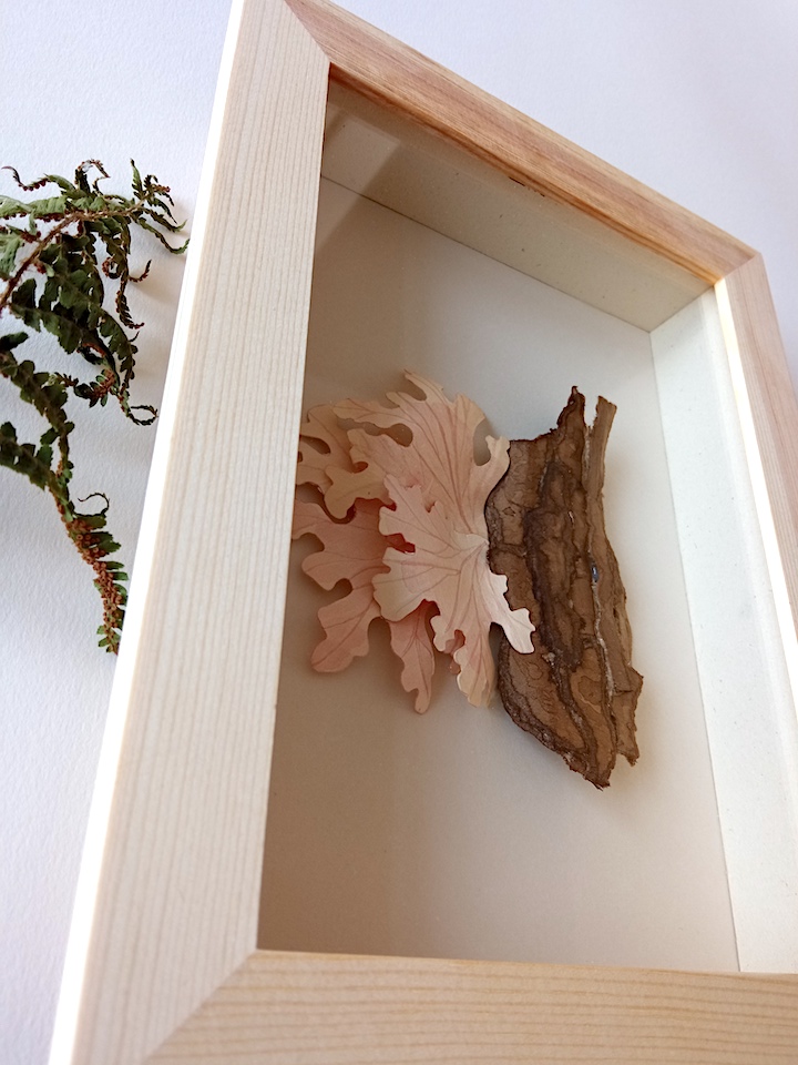 Écorce et lichen composent ce tableau de sous-bois. La composition de papier est découpée et façonnée à la main.